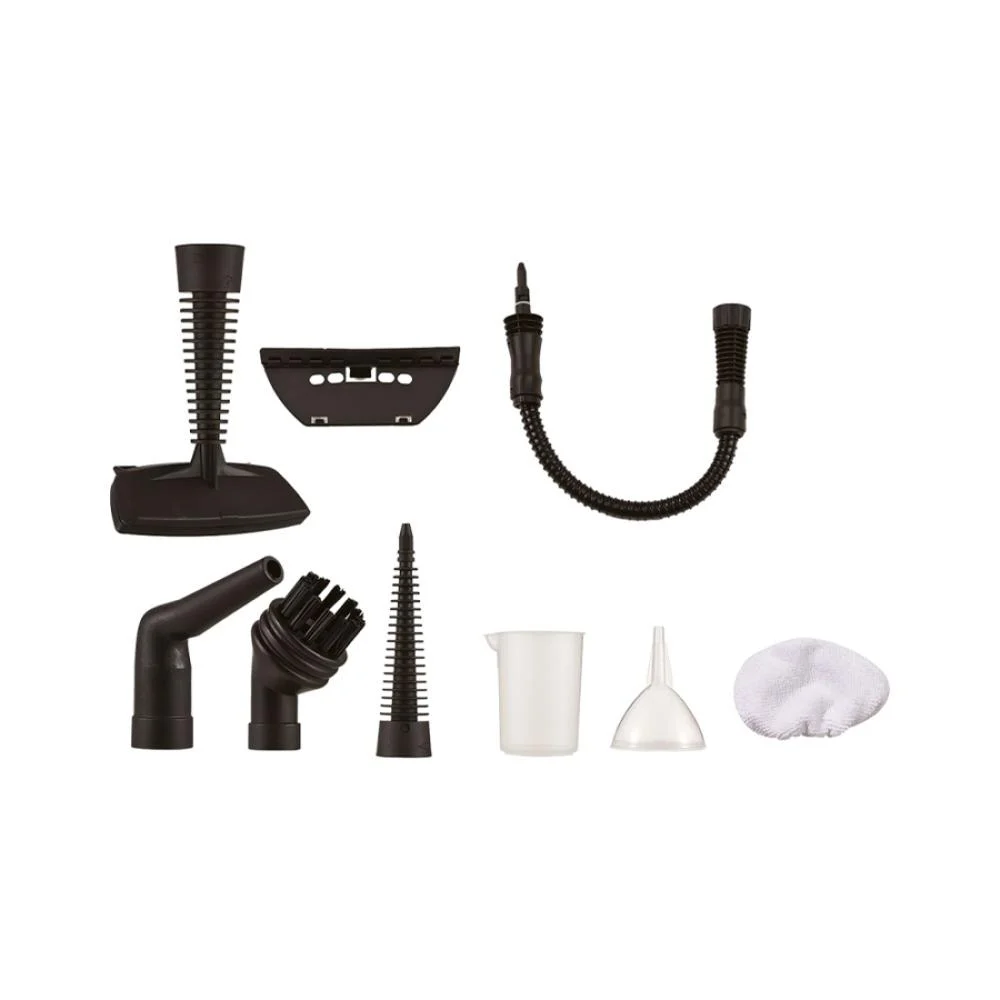 الملحقات: 1 كوب قياس 2 فوهة مستقيمة 3 خرطوم 4 قطعة قماش 5 فوهة منحنية 6 قمع .7 فرشاة تنظيف 8 ممسحة نوافذ و. فرشاة