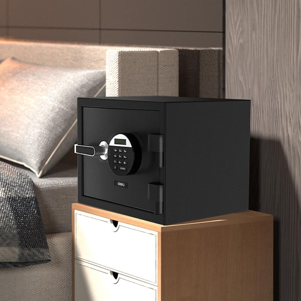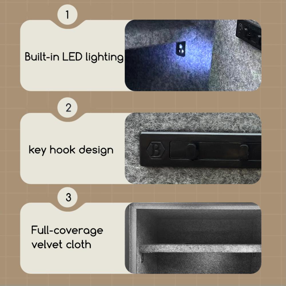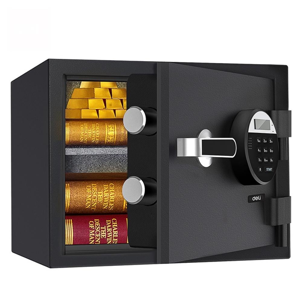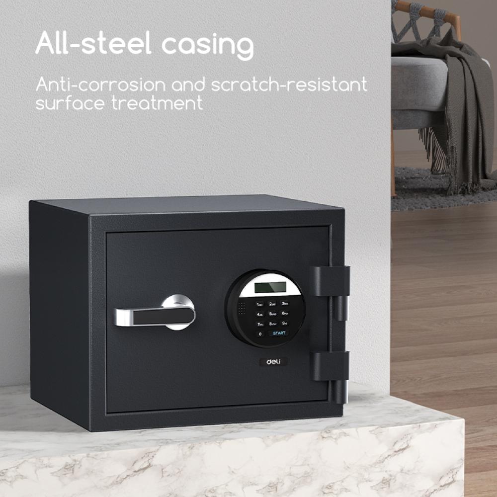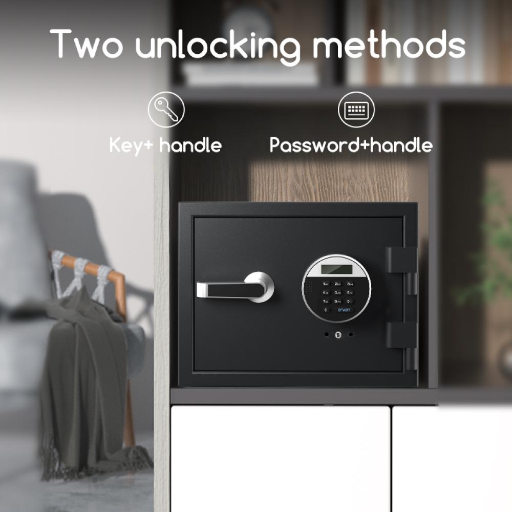درجة مئوية مقاومة للحريق لمدة 30 دقيقة: يمكن للغلاف المعدني أن يتحمل درجات الحرارة العالية، والطبقة الداخلية لها وظيفة مقاومة للهب - لوحة مدمجة بسيطة مع أزرار ثلاثية الأبعاد، شاشة LCD: اللوحة بسيطة وجميلة، الوظائف واضحة في لمحة، مع لوحة مفاتيح ثلاثية الأبعاد، تشعر بالراحة، عرض ضوء المؤشر، نص واضح - الحماية بكلمة مرور رقمية: بسيطة وعملية وتلبي الاحتياجات الأمنية في المكتب والمنزل - مصبوب من الفولاذ الكامل. قدرة عالية على مقاومة الكسر للوحة الباب: يمكن فتح القفل بطريقتين: كلمة المرور + المقبض، المفتاح + المقبض. مقبض الباب ذو تصميم فريد - مسمار قفل فولاذي صلب مقاوم للقطع: اثنان من مسامير القفل بسمك 20 مم، مصنوعان من مادة فولاذية صلبة بالكامل، مقاومتان للقطع والكسر - سمك الجدار 4 مم وسمك الباب 2 مم. - المنزل الذكي. إنها تبرز بغض النظر عن مكان وضعها: شكل مكعب، بسيط وجذاب - تقنية القطع بالليزر: قطع دقيق ومتكامل مع تزوير وتشكيل قوي - ينطبق على نطاق واسع على التركيبات في الجدران والخزائن - تفاصيل العرض: تصميم خطافي، إضاءة LED مدمجة، تنجيد فخم بالكامل