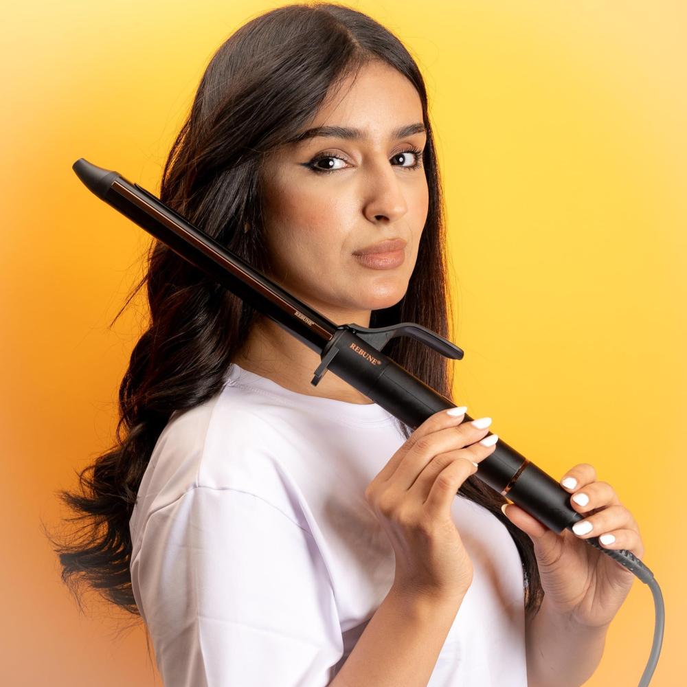 مكواة تجعيد الشعر الاحترافية من ريبون من السيراميك المزدوج بشكل انيق لإداء احترافي لمظهر متناسق وجذاب ونتائج تصفيف سريع وناعم بتمويجات للشعر مرضية لك و لستايلك ويعطيك نفس المظهر الصالونات وانت في منزلك في وقت قصير وقياسي والجهاز بتقنية الاحماء الفوري عند التشغيل في وقت قياسي 30 ثانية بخاصية للامد الطويل مع الاغلاق التلقائي بعد 60 دقيقه بمفتاح دوار للتشغيل والتحكم في درجات LED الحرارة وشاشة عرض