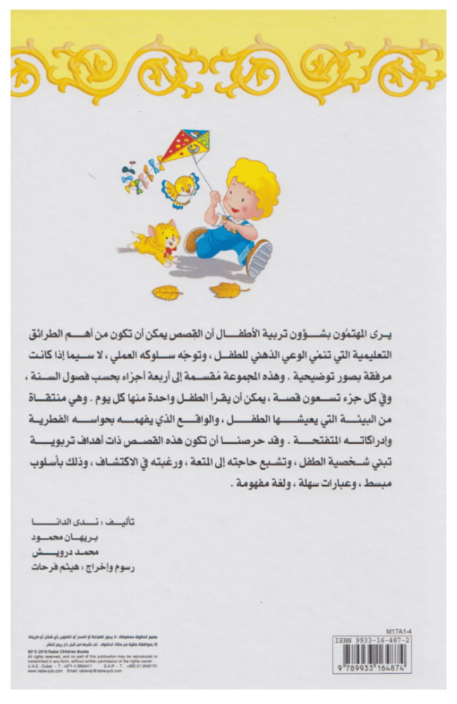 يرى المهتمون بشؤون تربية الأطفال أن القصص يمكن أن تكون من أهم الطرائق التعليمية التي تنمي الوعي الذهني للطفل، وتوجه سلوكه العملي، لا سيما إذا كانت مرفقة بصور توضيحية. وهذه المجموعة مقسمة إلى اربعة أجزاء بحسب فصول السنة، وفي كل جزء تسعون قصة، يمكن أن يقرأ الطفل واحدة منها كل يوم. وهي منتقاة من البيئة التي يعيشها الطفل، والواقع الذي يفهمه بحواسه الفطرية وإدراكاته المتفتحة. وقد حرصنا أن تكون هذه القصص ذات أهداف تربوية تبني شخصية الطفل، وتشبع حاجته إلى المتعة، ورغبته في الإكتشاف، وذلك بأسلوب مبسط، وعبارات سهلة، ولغة مفهومة.
