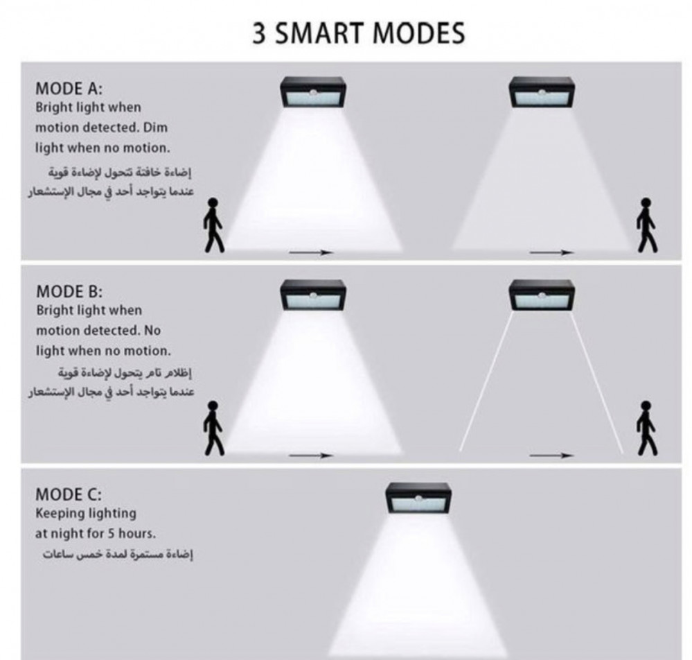 التحكم في الإثارة : يضيء تلقائيا بعد غروب الشمس بالضغط على الزر تشغيل الاثارة للحصول على اثارة منخفضة + زر الاثارة الحمراء كشف الاثارة الساطعة - مدة 25 ثانية ، وإطفاء الإثارة