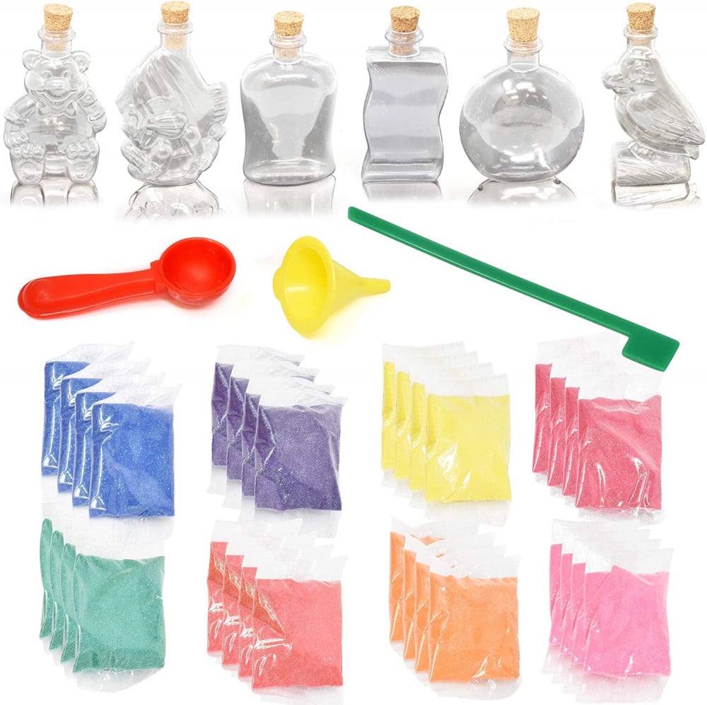 Create your own kids sand painting kit, rainbow craft kit that includes 6 shaped sand bottles, sand tool, scoop, funnel and 8 glitter sand colors.